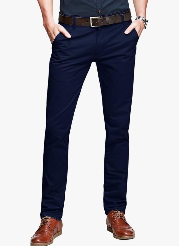 Our High Quality Navy Blue Soft Khaki Men's Trousers Features zipper fly and button closure, front slant pockets, fifth-coin pocket at waistband, and classic back welt pockets Fitted through hip and thigh, with tapered leg. Sits below the waist Straight leg: Straight through the seat and thigh with straight leg opening Classic style: Soft, high quality fabric, very comfortable to wear